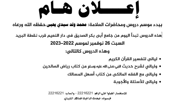 فضيلة العالم الجليل محمد ولد سيدي يحي يعلن عن إطلاق سلسة من الدروس والمحاضرات تم تداول اليوم في مواقع التواصل…