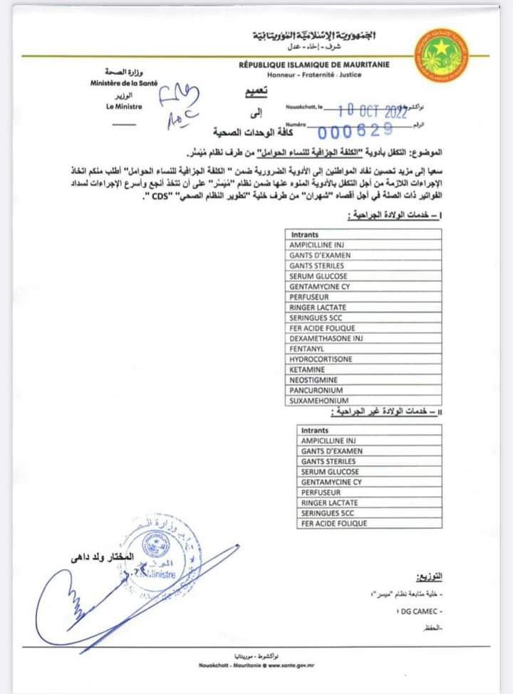 وجه معالي وزير الصحة السيد المختار ولد داهي تعميما إلى جميع الوحدات الصحية يقضي بالتكفل بأدوية التكلفة الجزافية للنساء الحوامل…