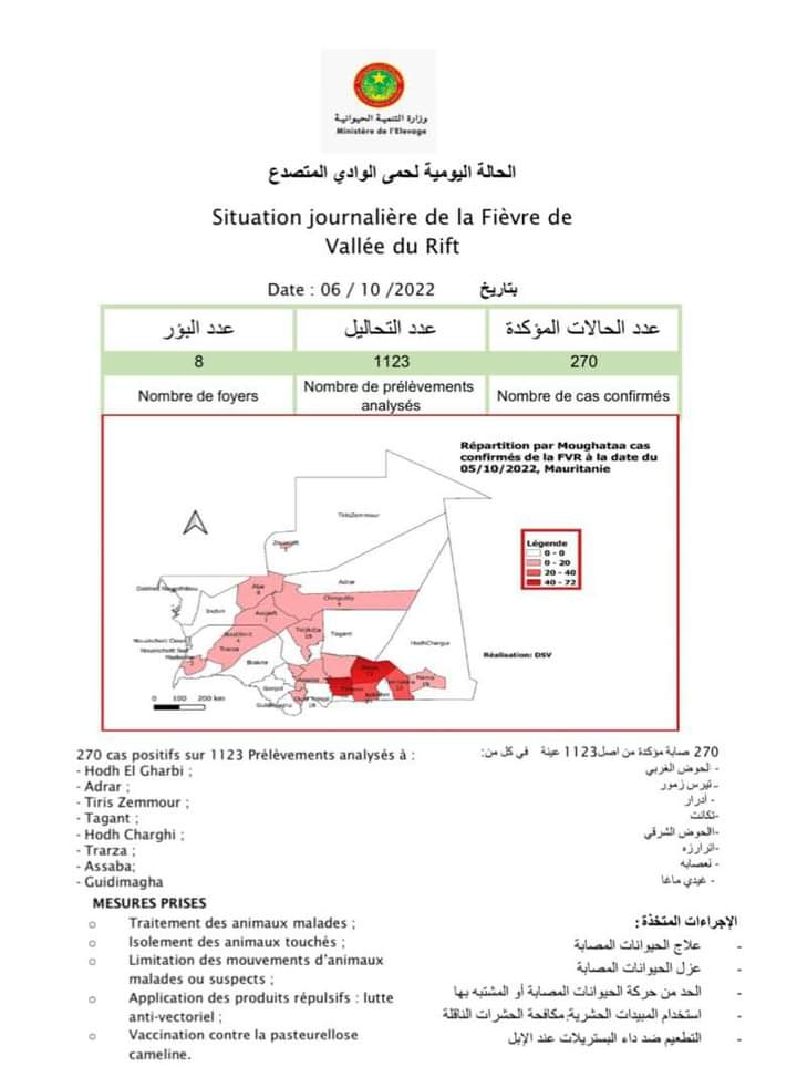 الحالة اليومية لحمى الوادي المتصدع التاريخ: 06 اكتوبر 2022؛ عدد الحالات المؤكدة: 270؛ عدد التحاليل: 1123 عدد البؤر: 8 —————…