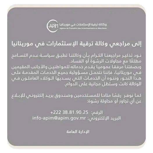 وضعت وكالة ترقية الاستثمار بموريتانيا رقما وبريدا إلكترونيا لمراجعيها مع الإعلان عن مجانية خدماتها التي كانت وماتزال كذلك حسب الإعلان.…