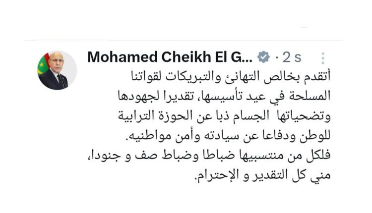 هنأ رئيس الجمهورية السيد محمد ولد الشيخ الغزواني، القوات المسلحة، بمناسبة عيد تأسيسها. وكتب على حسابه الرسمي على منصة (اكس)…