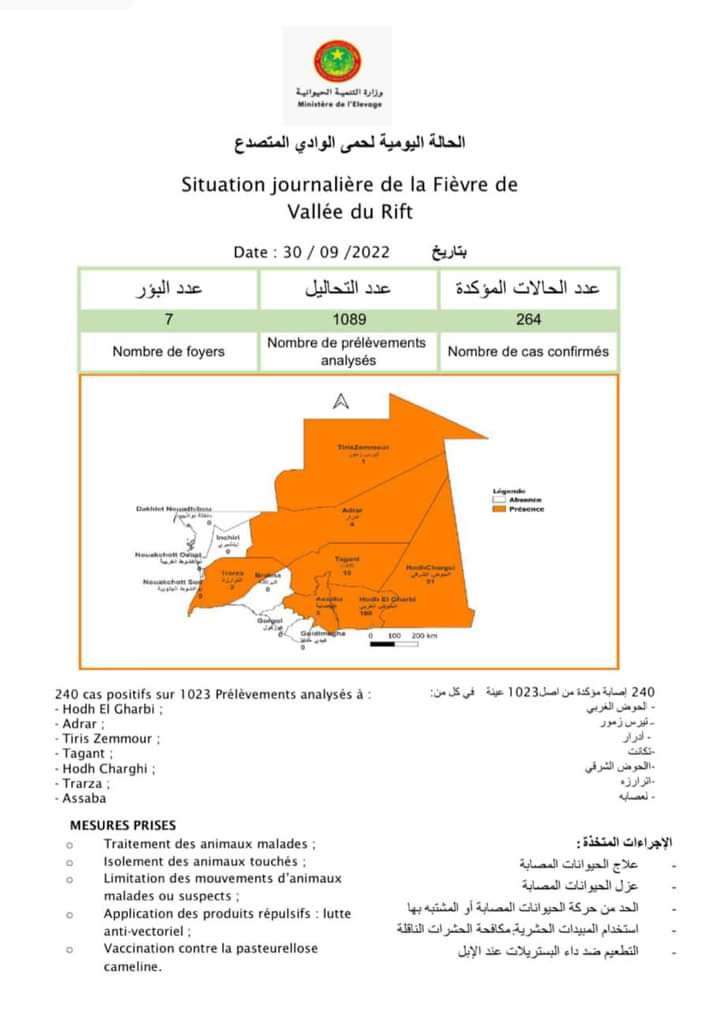 الحالة اليومية لحمى الوادي المتصدع ————————————— التاريخ: 30 سبتمبر 2022؛ عدد الحالات المؤكدة: 264؛ عدد التحاليل: 1089 عدد البؤر: 7…