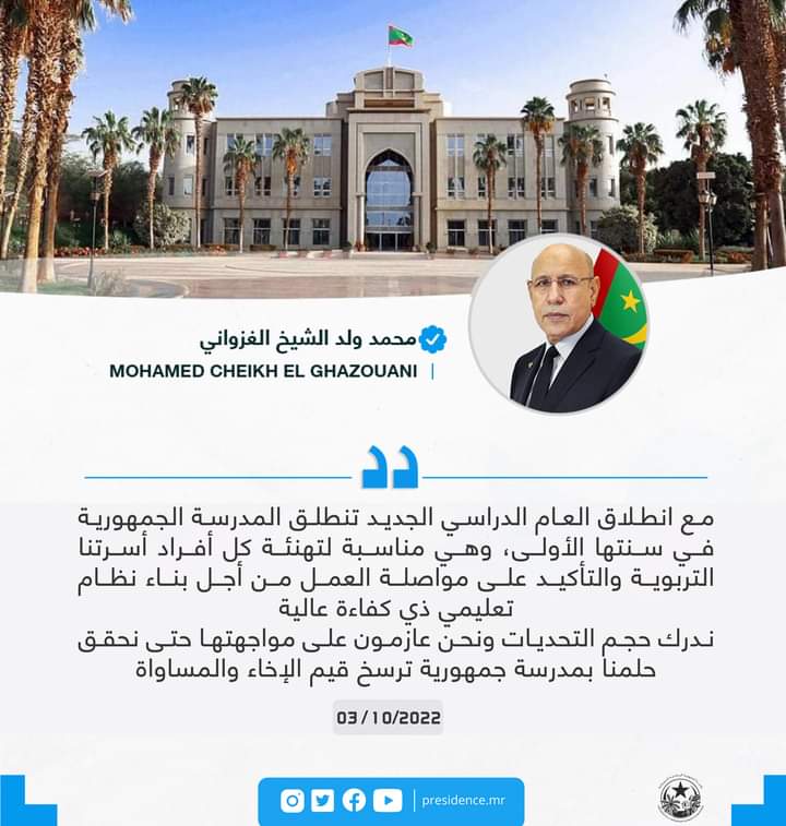 فخامة رئيس الجمهورية من حسابه على تويتر ” مع انطلاق العام الدراسي الجديد تنطلق المدرسة الجمهورية في سنتها الأولى، وهي…