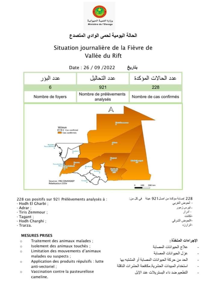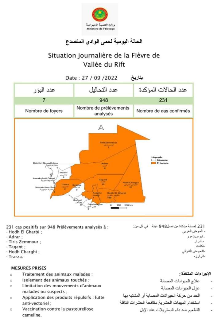 الحالة اليومية لحمى الوادي المتصدع ————————————— التاريخ: 27 سبتمبر 2022؛ عدد الحالات المؤكدة: 231؛ عدد التحاليل: 948 عدد البؤر: 7…