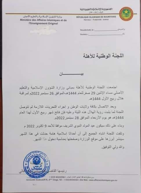 أعلنت لجنة الأهلة أن يوم الأربعاء 28سبتمر فاتح غرة شهر ربيع الأول