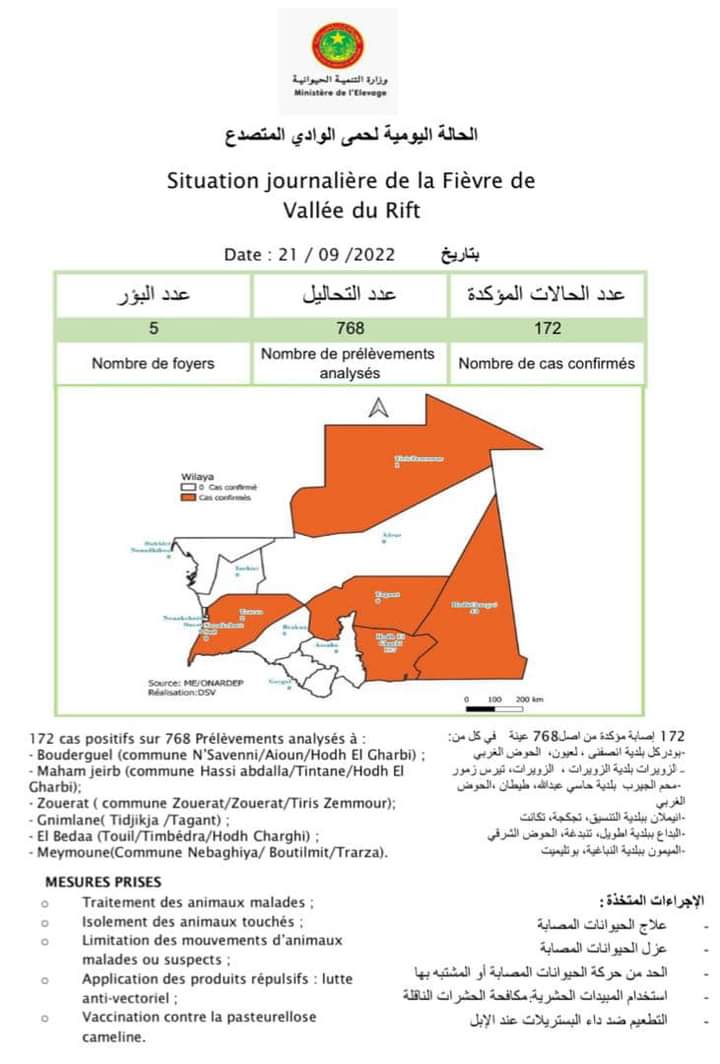 النشرة اليومية الخاصة بحمى الوادي المتصدع ————————————— التاريخ: 21 سبتمبر 2022؛ عدد الحالات المؤكدة: 172؛ عدد التحاليل:768 عدد البؤر :5…