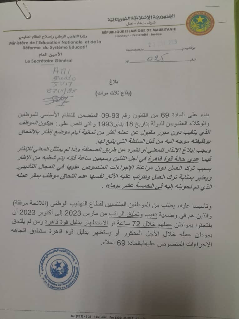 نشرت وزارة التهذيب الوطني وإصلاح النظام التعليمي بلاغا تضمن -إنذارا. بالفصل لمن لم يباشر عمله أو يستظهر بقوة قاهرة من 195…