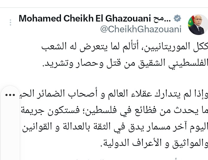 رئيس الجمهورية يدون عبر صفحته على اتويتر عن ما يحدث في غزة: ككل الموريتانيين، أتألم لما يتعرض له الشعب…