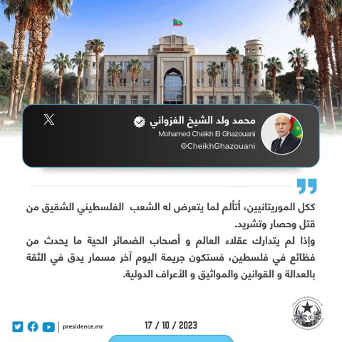 رئيس الجمهورية محمد ولد الشيخ الغزواني يتألم لما يتعرض له الشعب الفلسطيني الشقيق من قتل وحصار وتشريد.