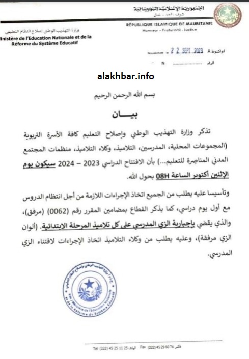 وزارة التهذيب تذكر الأباء بموعد الافتتاح المدرسي