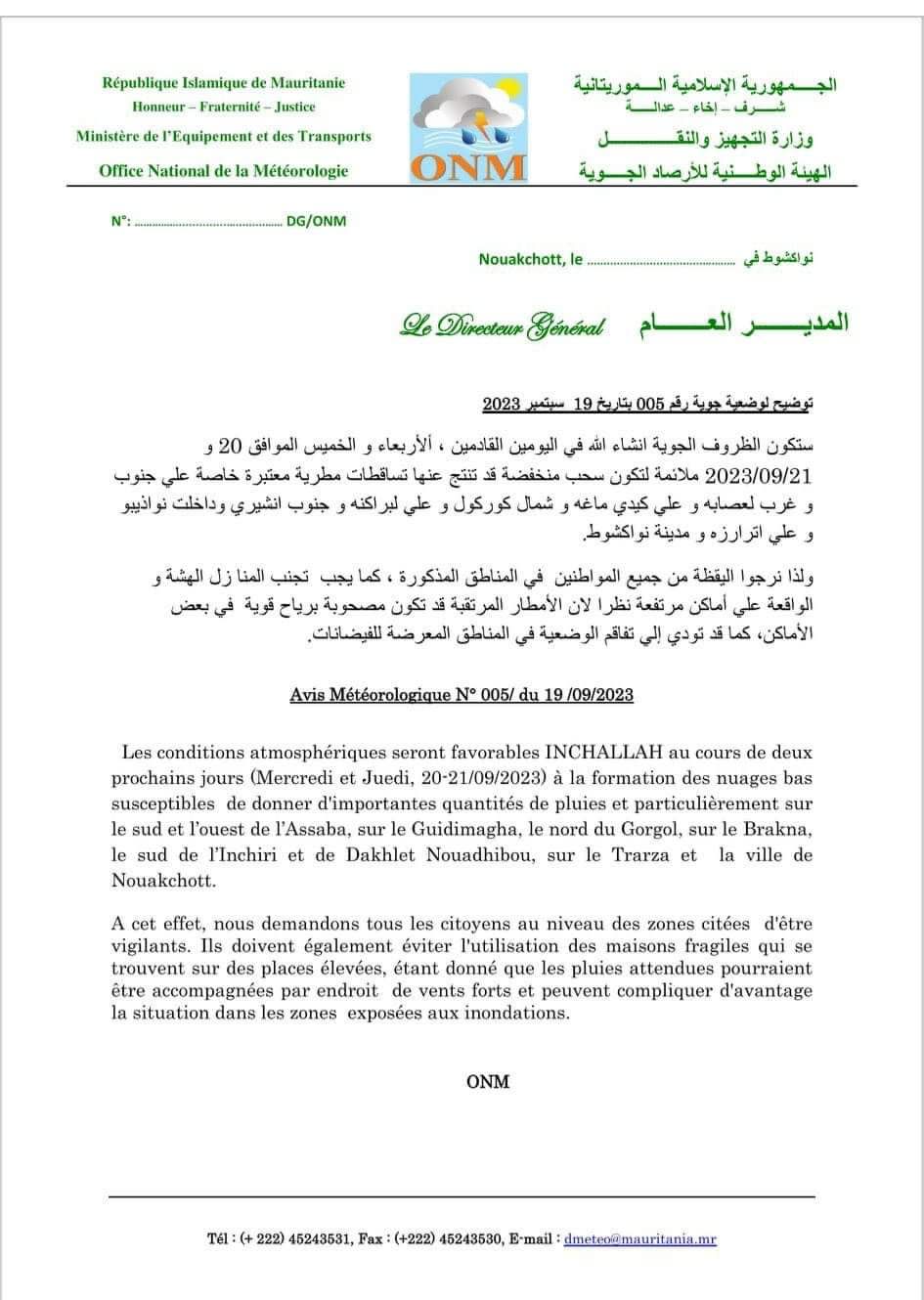 حذرت الهيئة الوطنية للأرصاد الجوية في بيان وزعته من أمطار وصفتها بالمعتبرة، تصاحبها رياح قوية في مناطق متفرقة من موريتانيا،…