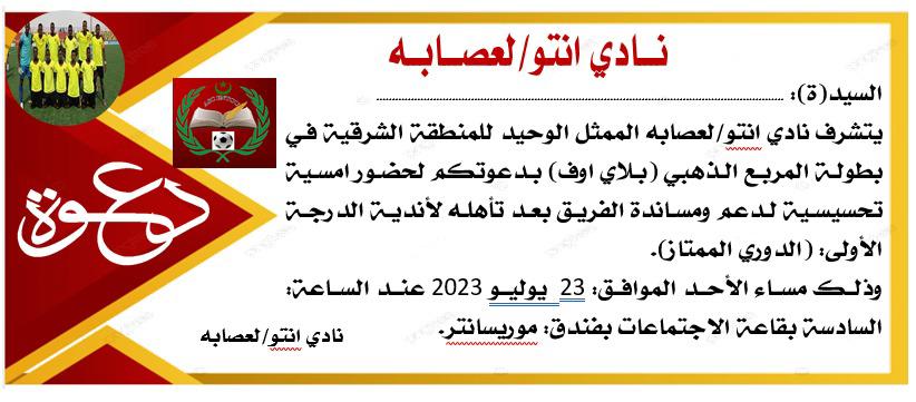 يتشرف نادي انتو/لعصابة الممثل الوحيد للمنطقة الشرقية في بطولة المربع الذهبي (بلاي اوف) بدعوتكم لحضور امسية تحسيسية لدعم ومساندة الفريق…