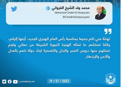 هنأ الرئيس الموريتاني محمد ولد الشيخ الغزواني الشعب الموريتاني بمناسبة رأس العام الهجري الجديد وهذا نص التهنئة: “ تهنئة مني…