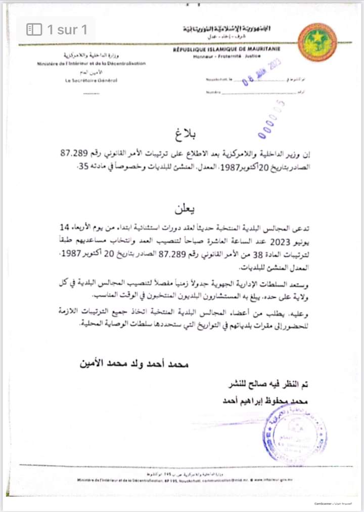 بلاغ؛ إن وزير الداخلية واللامركزية بعد الاطلاع على ترتيبات الأمر القانوني رقم 87.289 الصادر بتاريخ 20أكتوبر1987، المعدل، المنشئ للبلديات وخصوصاً…
