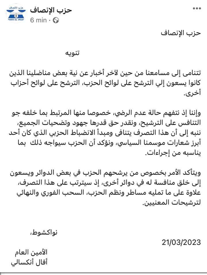حذر حزب الإنصاف المغاضبين المنسحبين منه في بيان وزعه اليوم يذكرهم فيه بالعقوبات المترتبة عل مخالفة الانضباط الحزبي