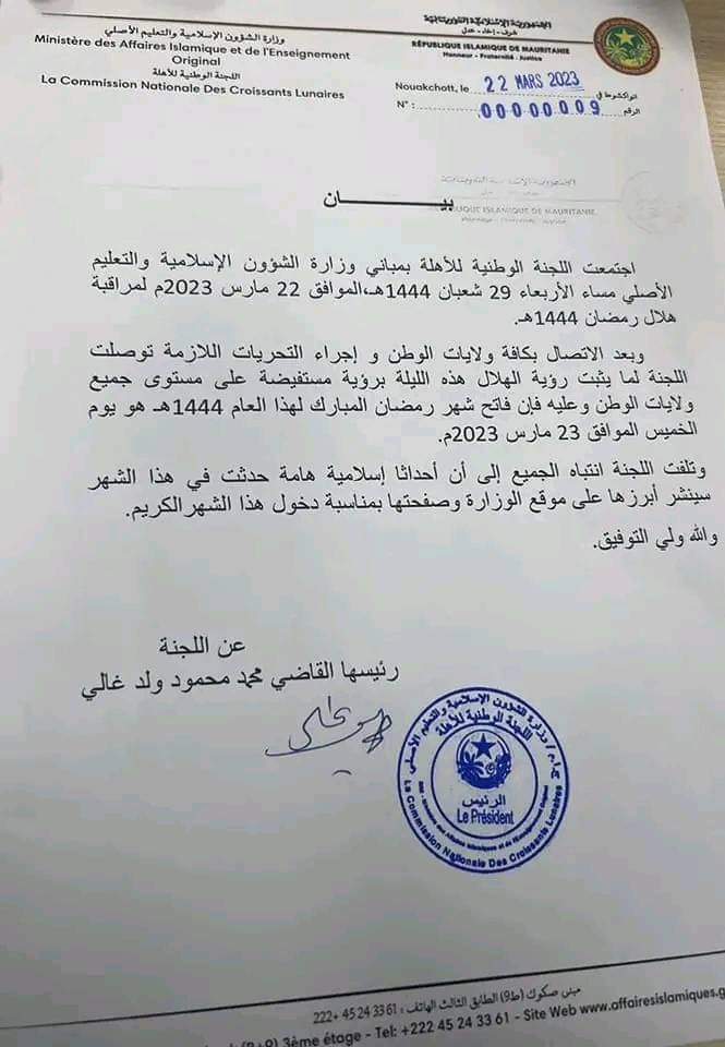 أعلنت اللجنة الوطنية للأهلة، في موريتانيا، اليوم الاثنين، أن مراقبة هلال شهر رمضان المبارك للعام 1444 هـ، ستكون مساء الأربعاء…