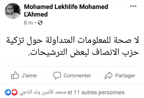 نفى المستشار الإعلامي لرئيس حزب الإنصاف، محمد لخليفه صحة المعلومات المتداولة حول تزكية الحزب لبعض الترشيحات، في الانتخابات النيابية والبلدية المرتقبة.…