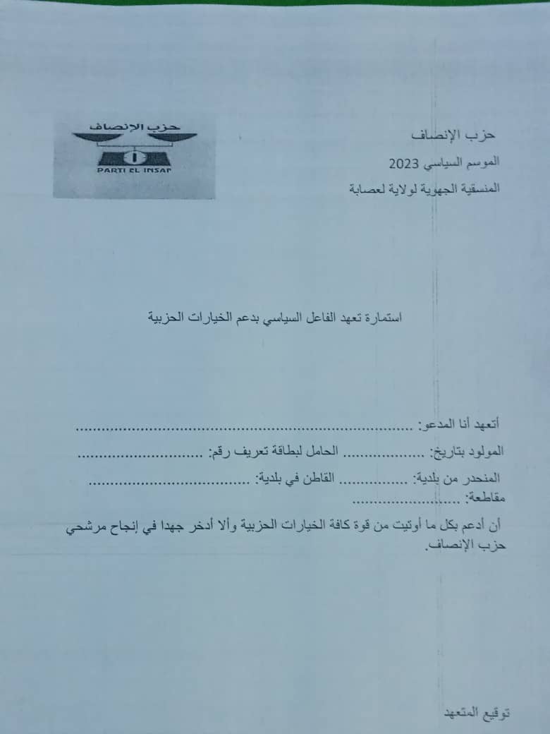 استمارة التعهد لحزب الانصاف (صورة )